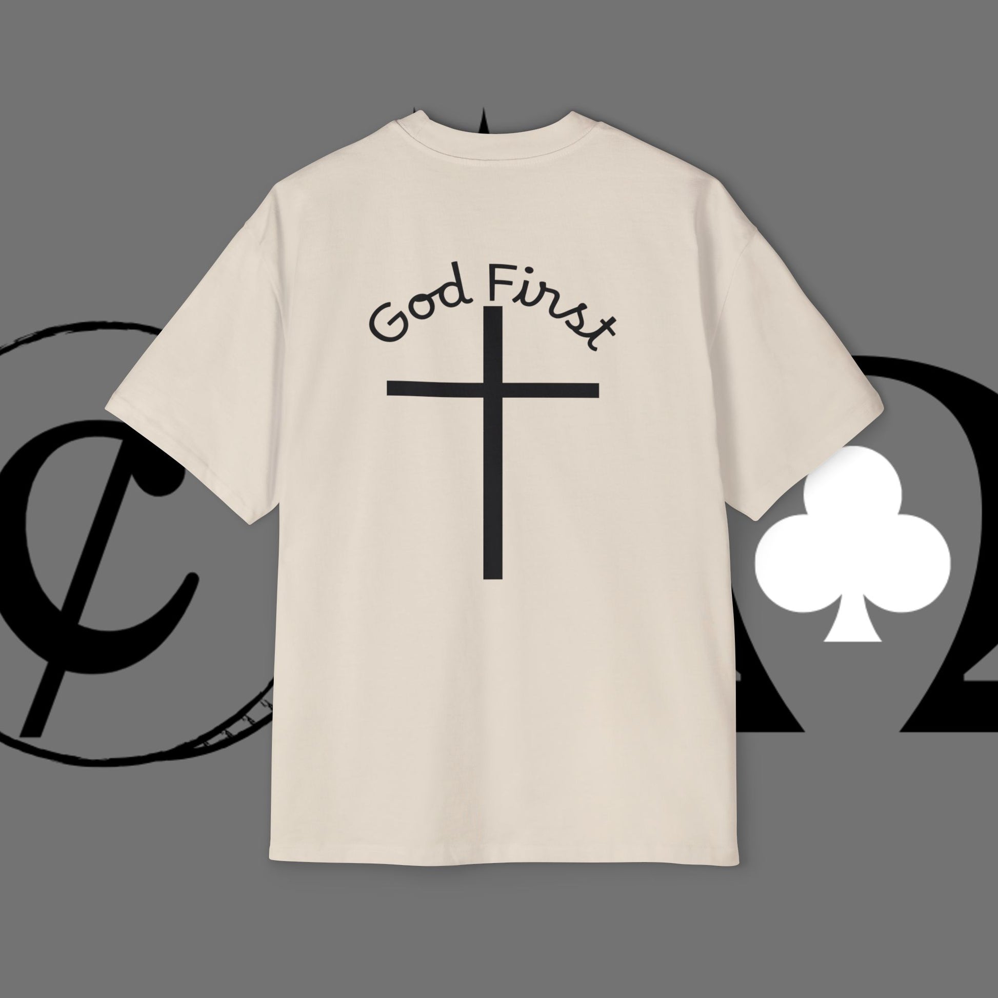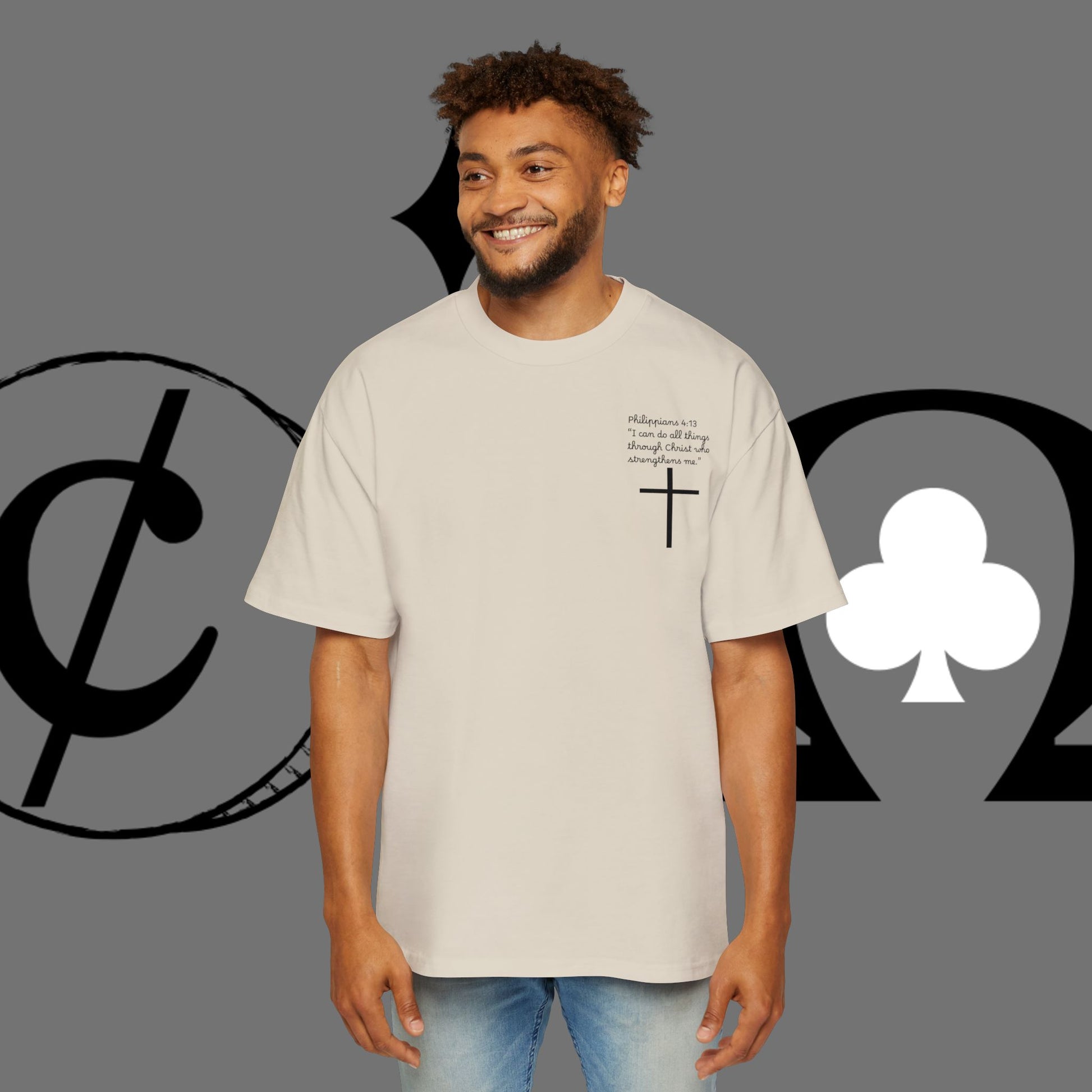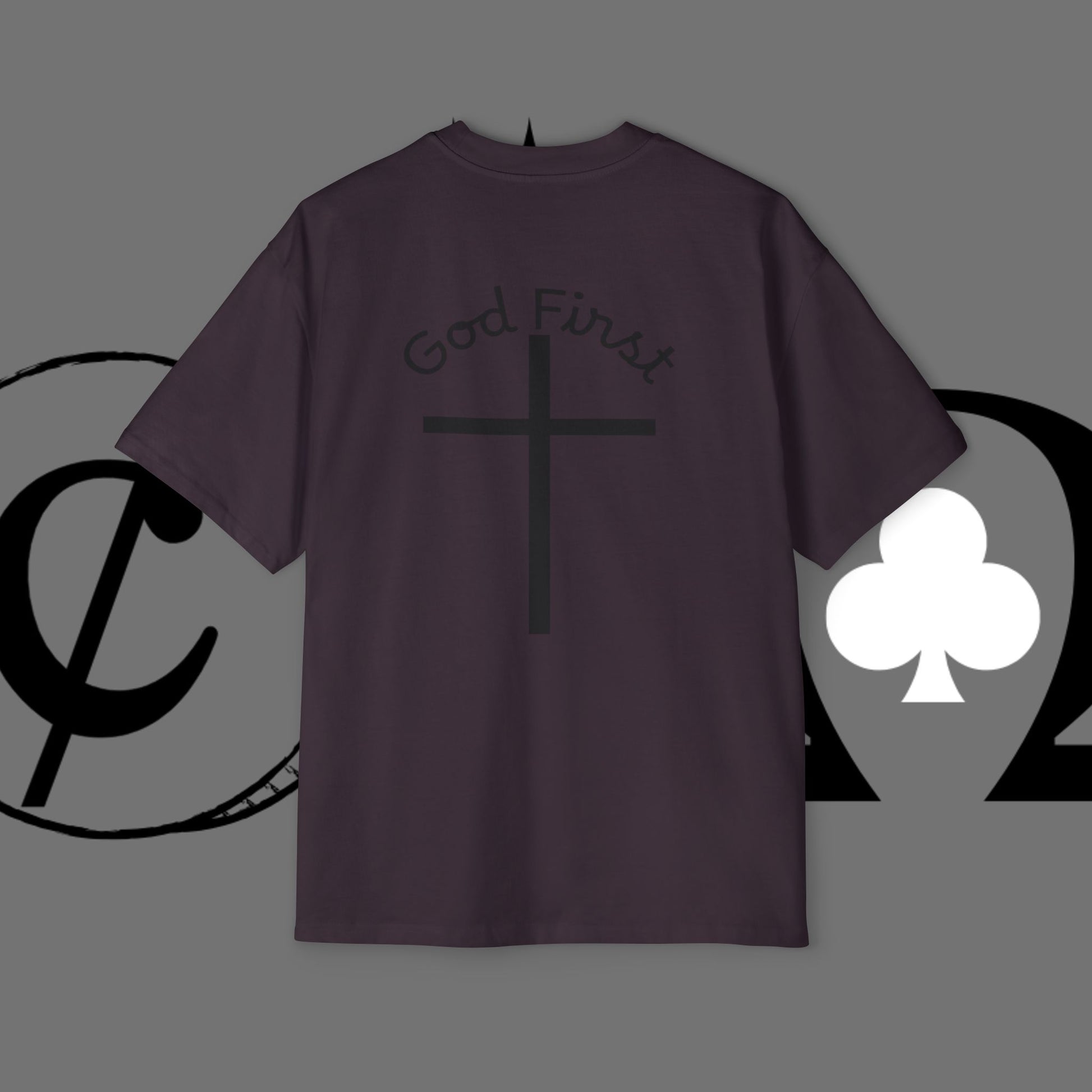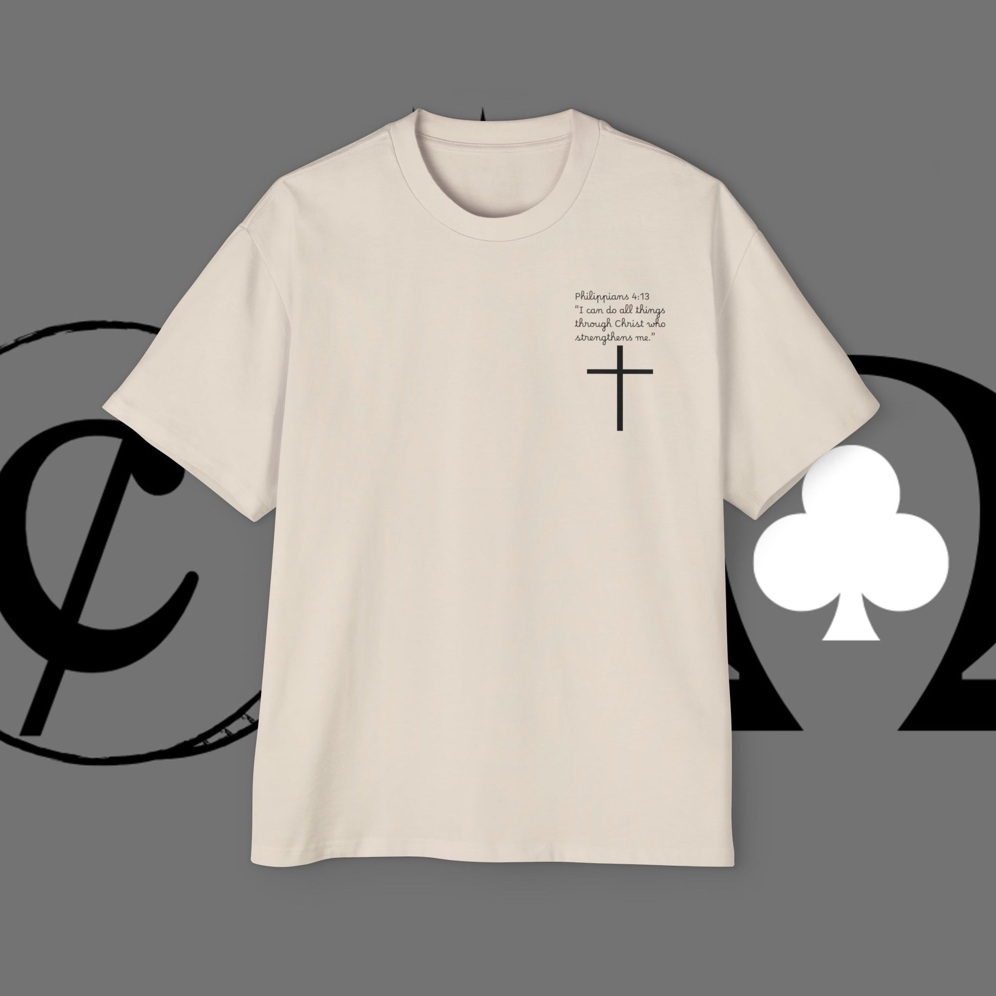 An oversized cotton tee with quiet, symbolic style. The shirt sits low on the shoulders and hangs loose, letting the bold, typographic graphic breathe across the chest. Midweight carded cotton gives structure and a lived-in feel that softens with wear; reinforced shoulder tape and double-needle hems keep the shape through countless wears. It reads like someone who values subtle symbolism and easy confidence — worn to street-side coffee runs, late-night crate-digging, or casual gallery nights. The clean white canvas makes the black emblem pop, while the roomy cut layers easily over long-sleeve tees or under a cropped jacket for a deliberately relaxed silhouette.
