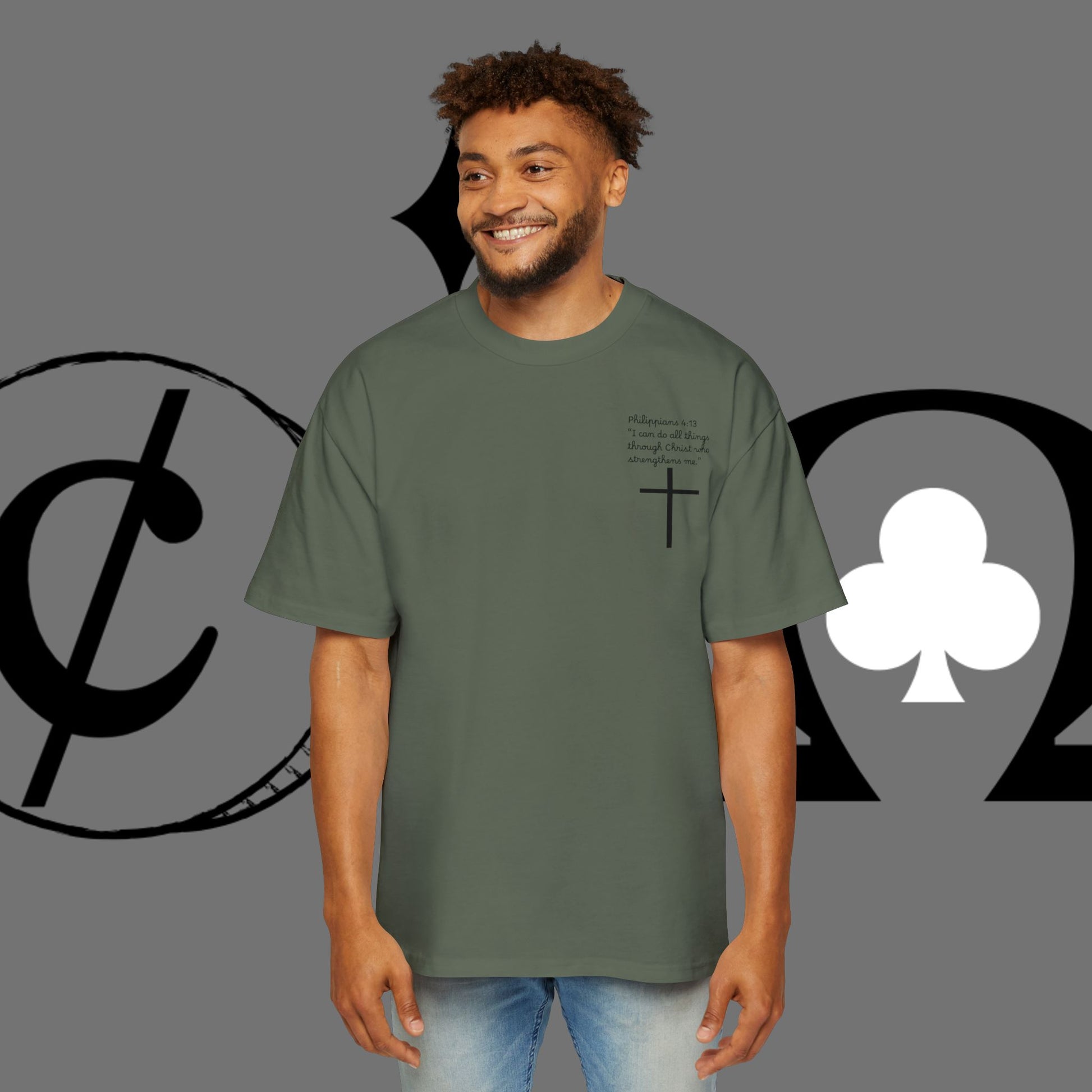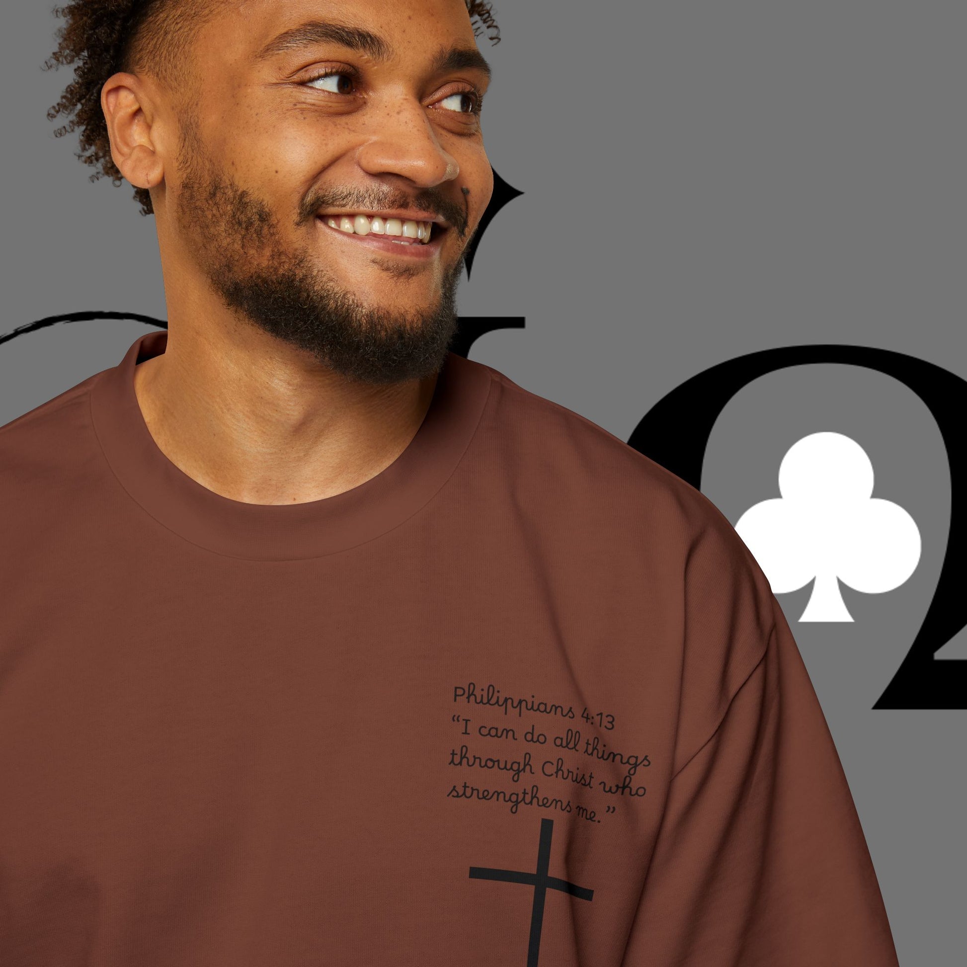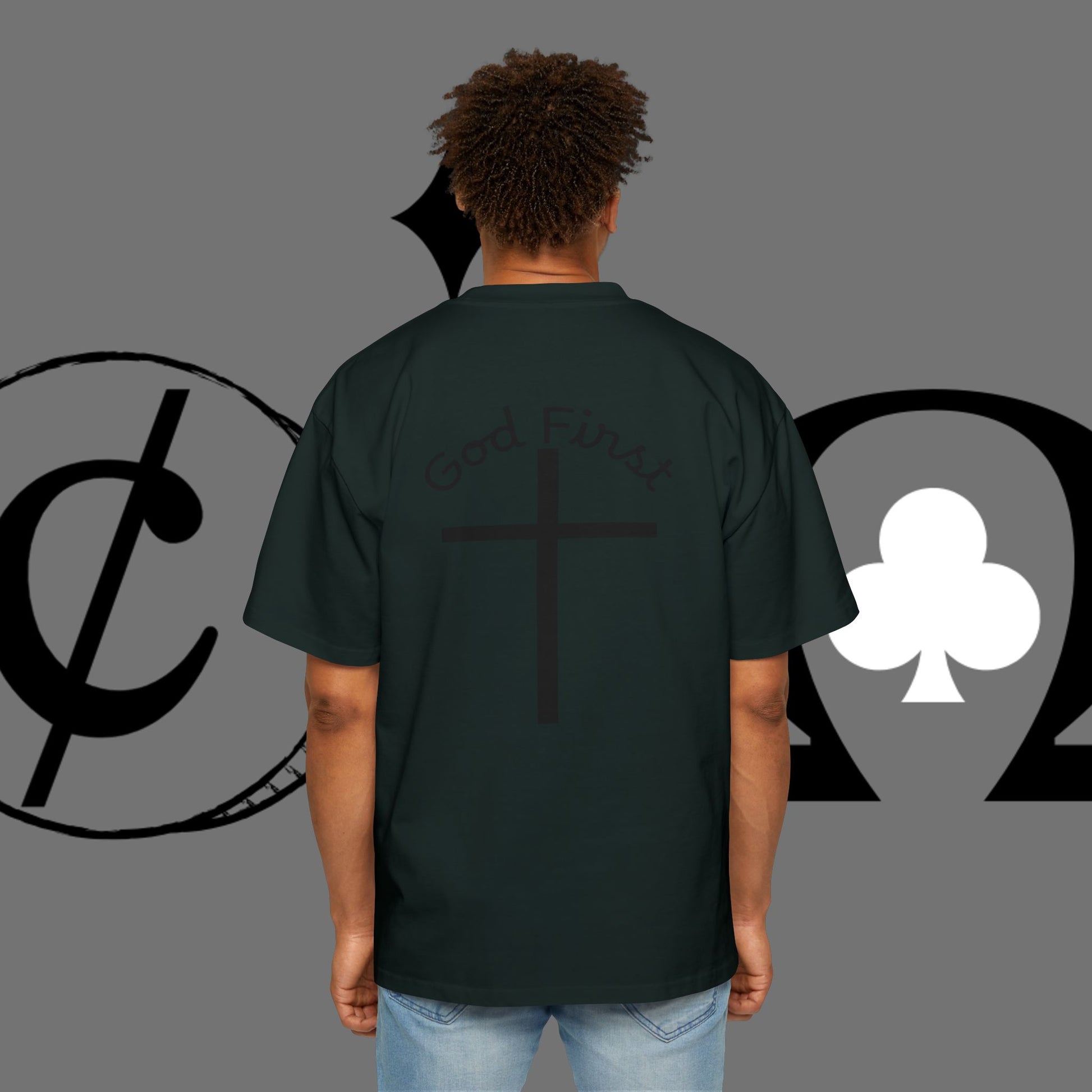 An oversized cotton tee with quiet, symbolic style. The shirt sits low on the shoulders and hangs loose, letting the bold, typographic graphic breathe across the chest. Midweight carded cotton gives structure and a lived-in feel that softens with wear; reinforced shoulder tape and double-needle hems keep the shape through countless wears. It reads like someone who values subtle symbolism and easy confidence — worn to street-side coffee runs, late-night crate-digging, or casual gallery nights. The clean white canvas makes the black emblem pop, while the roomy cut layers easily over long-sleeve tees or under a cropped jacket for a deliberately relaxed silhouette.