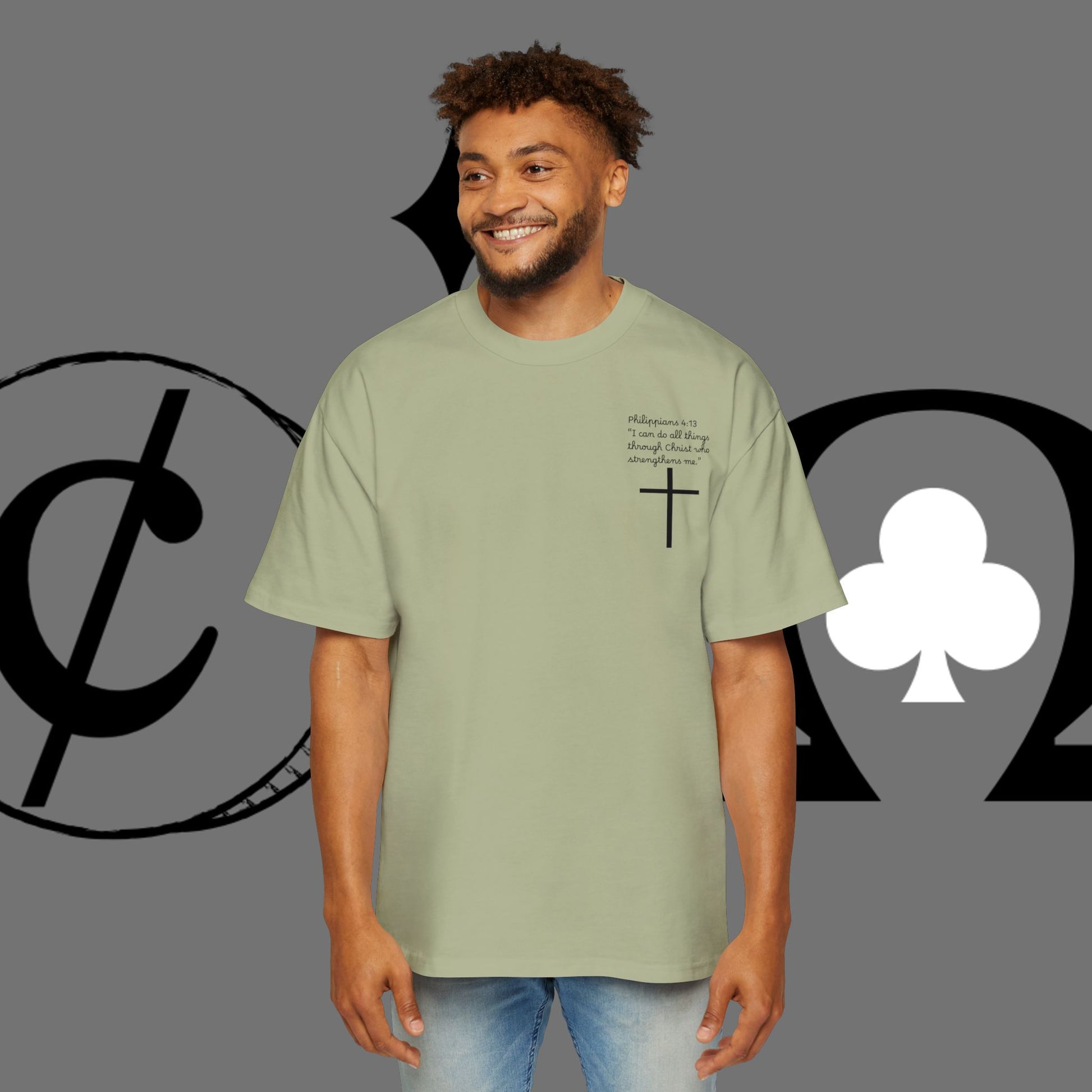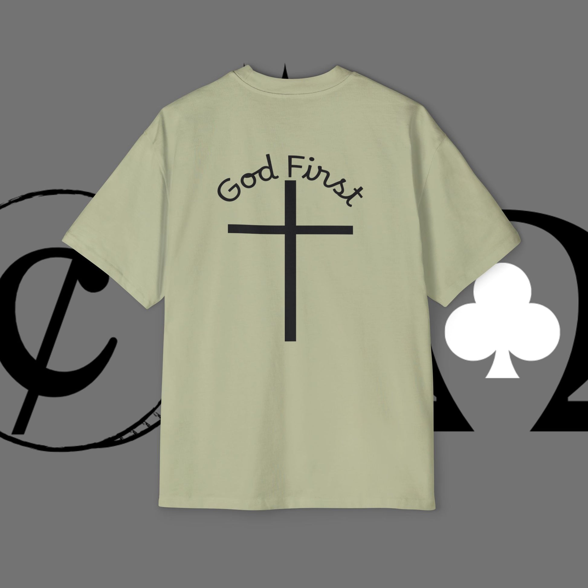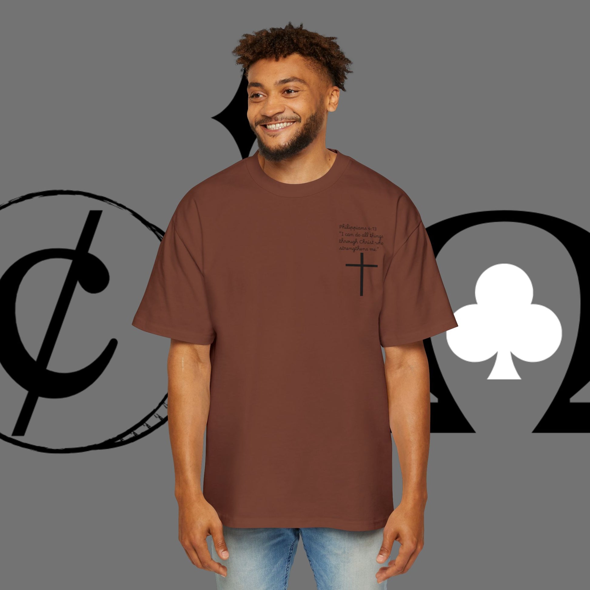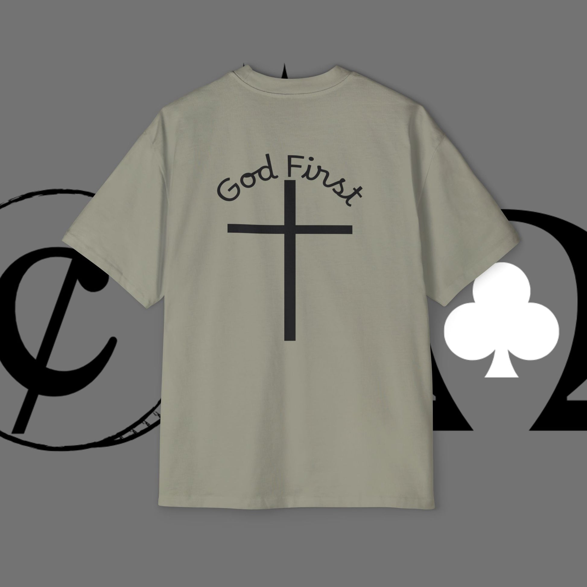 An oversized cotton tee with quiet, symbolic style. The shirt sits low on the shoulders and hangs loose, letting the bold, typographic graphic breathe across the chest. Midweight carded cotton gives structure and a lived-in feel that softens with wear; reinforced shoulder tape and double-needle hems keep the shape through countless wears. It reads like someone who values subtle symbolism and easy confidence — worn to street-side coffee runs, late-night crate-digging, or casual gallery nights. The clean white canvas makes the black emblem pop, while the roomy cut layers easily over long-sleeve tees or under a cropped jacket for a deliberately relaxed silhouette.