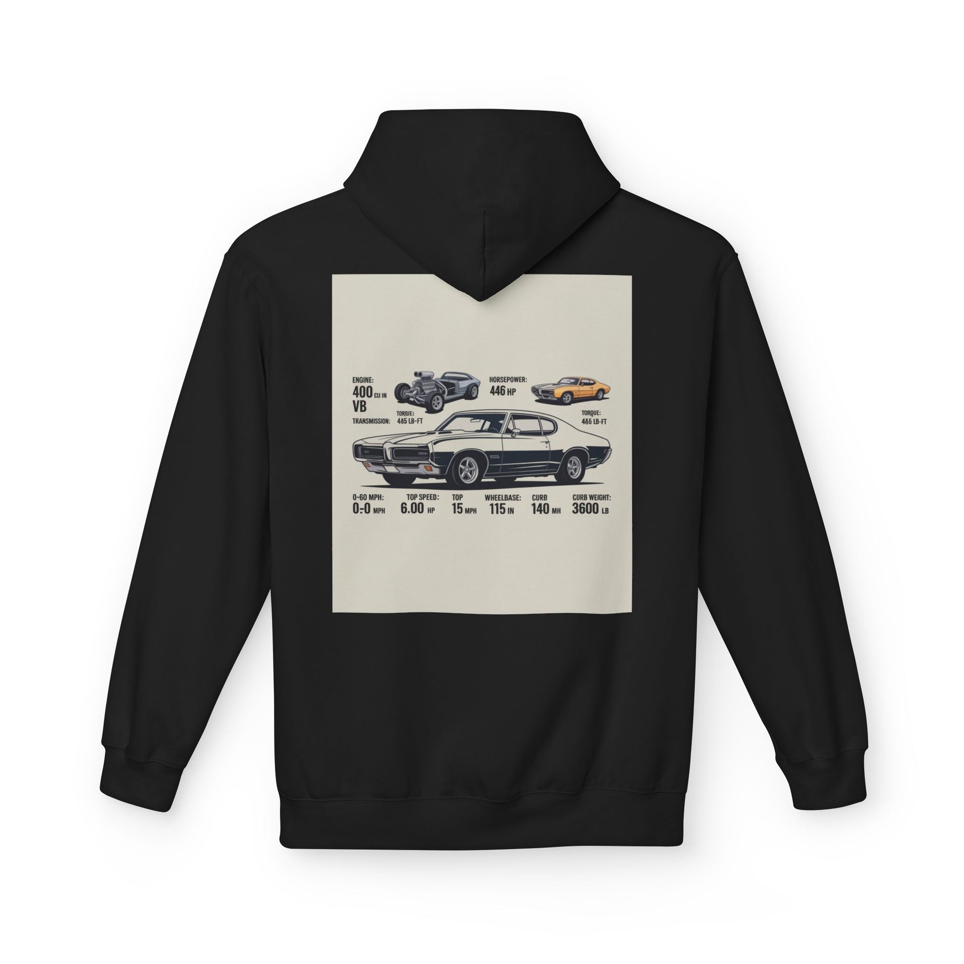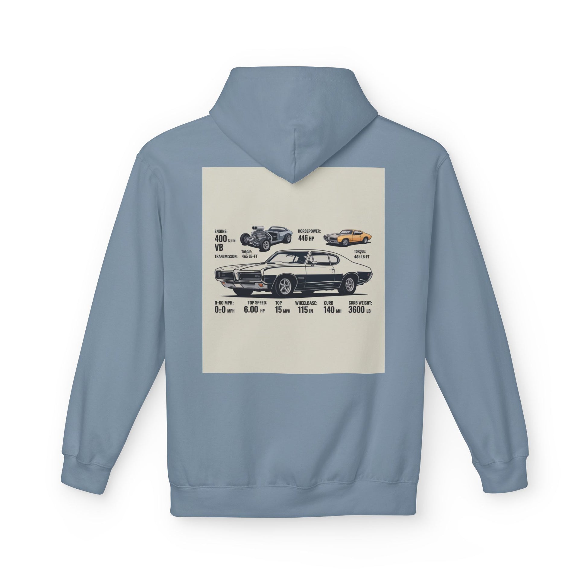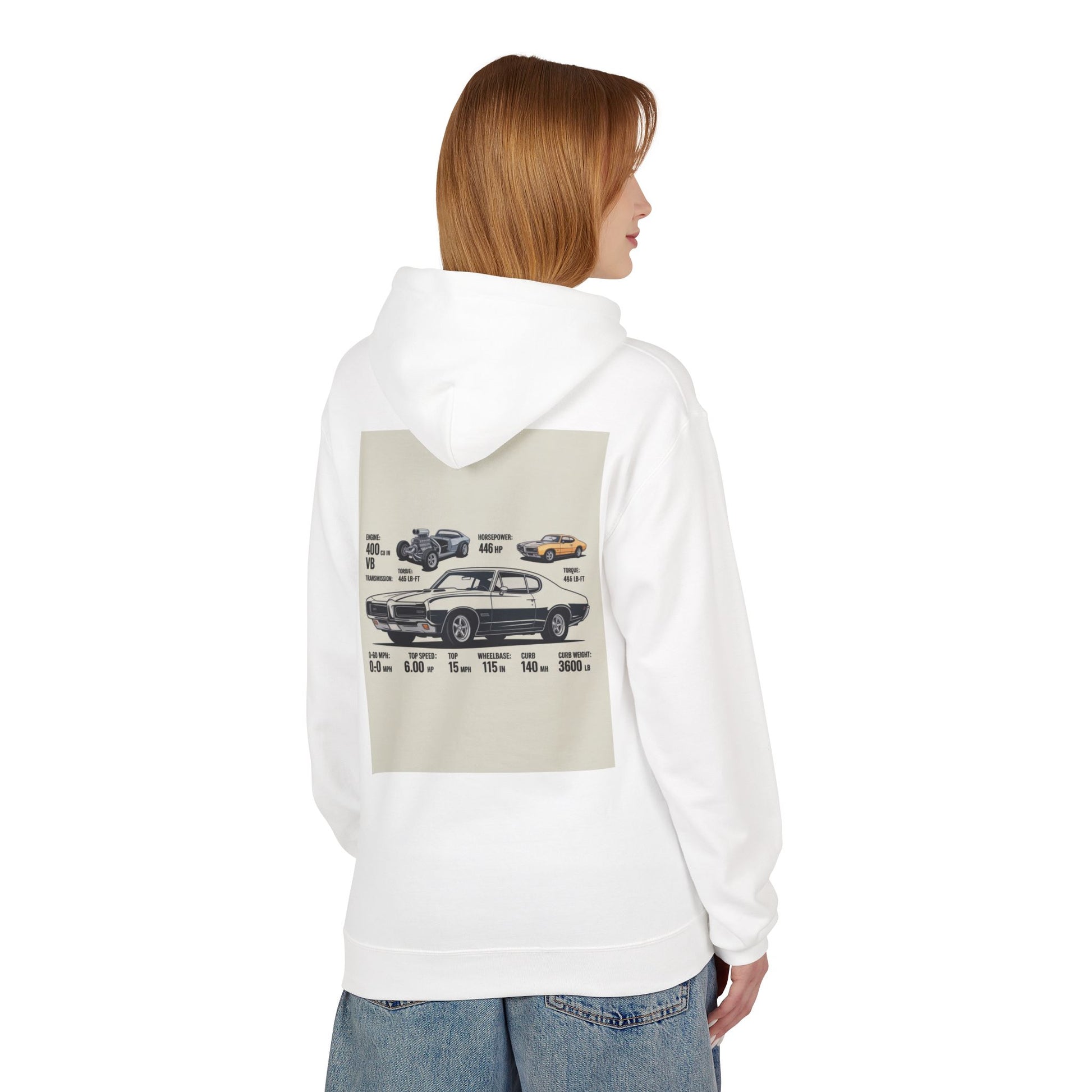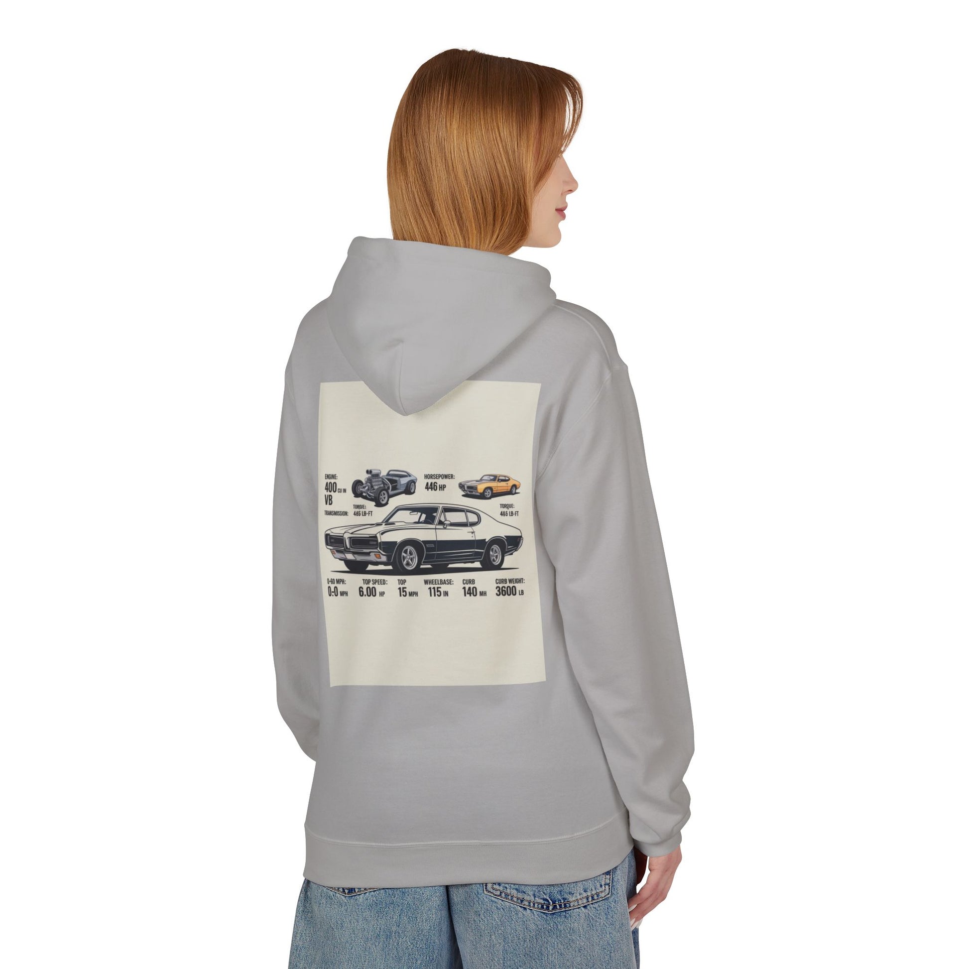 Soft, familiar, and quietly confident — this midweight hoodie feels like the jacket you reach for on crisp mornings and late-night drives. A compact vintage muscle car sits over the heart, while a larger technical illustration rests across the back: engine specs, silhouette, and small details laid out like a mechanic’s sketch. It’s not flashy; it’s for people who love the hum of an old V8, the smell of oil, and the patient rhythm of restoring something with their own hands. Wear it to the garage, to car meets, or on weekend runs when you want comfort that nods to a shared automotive language.
