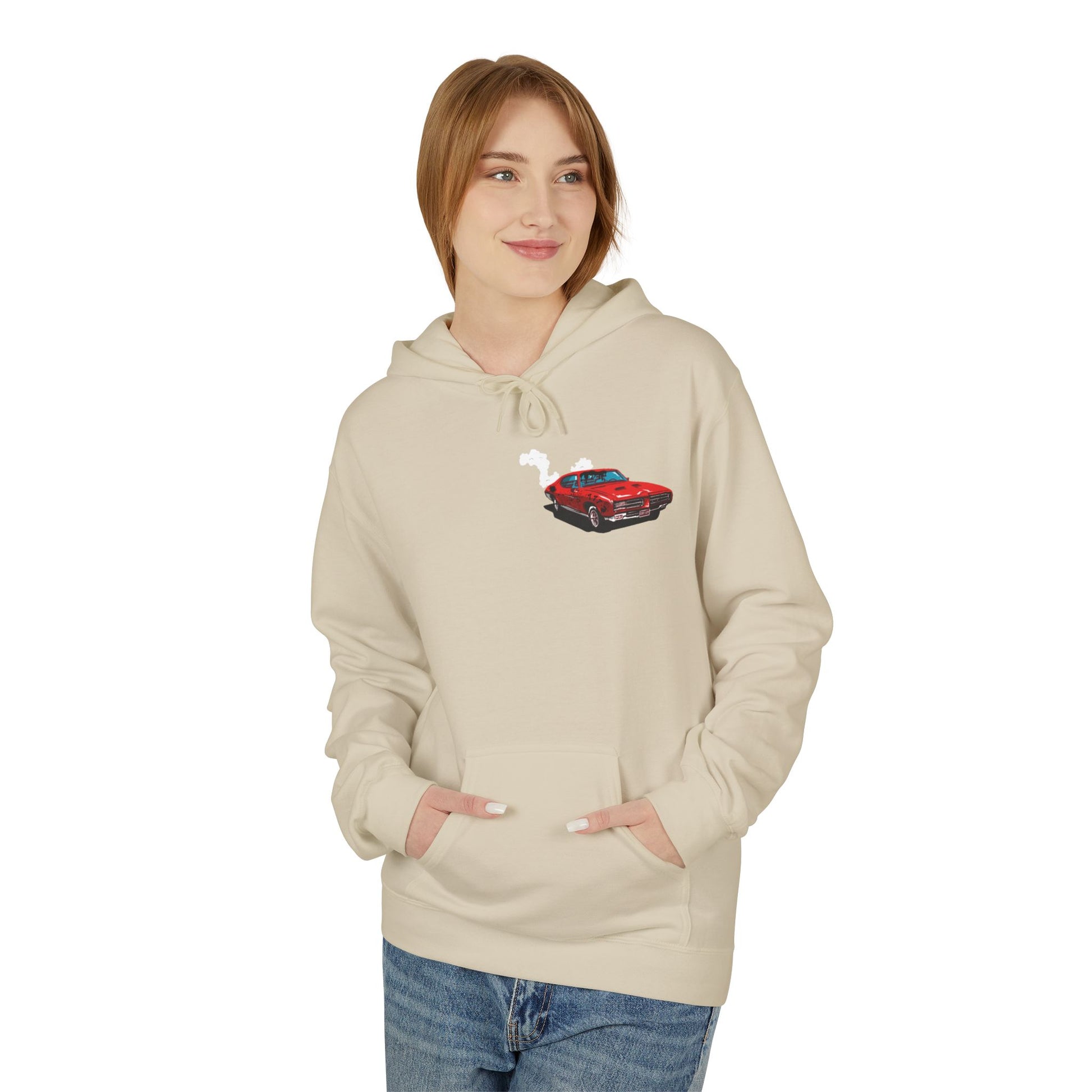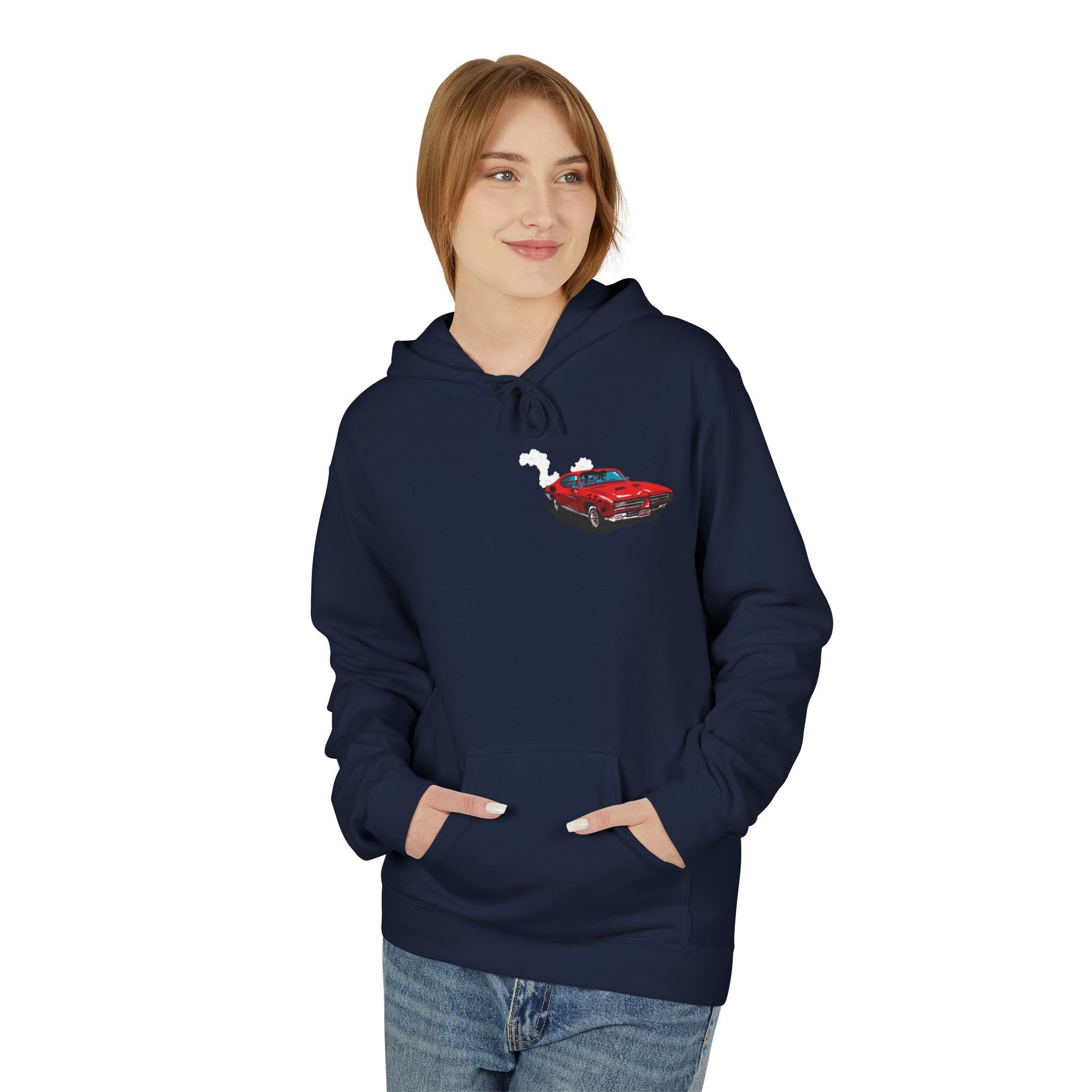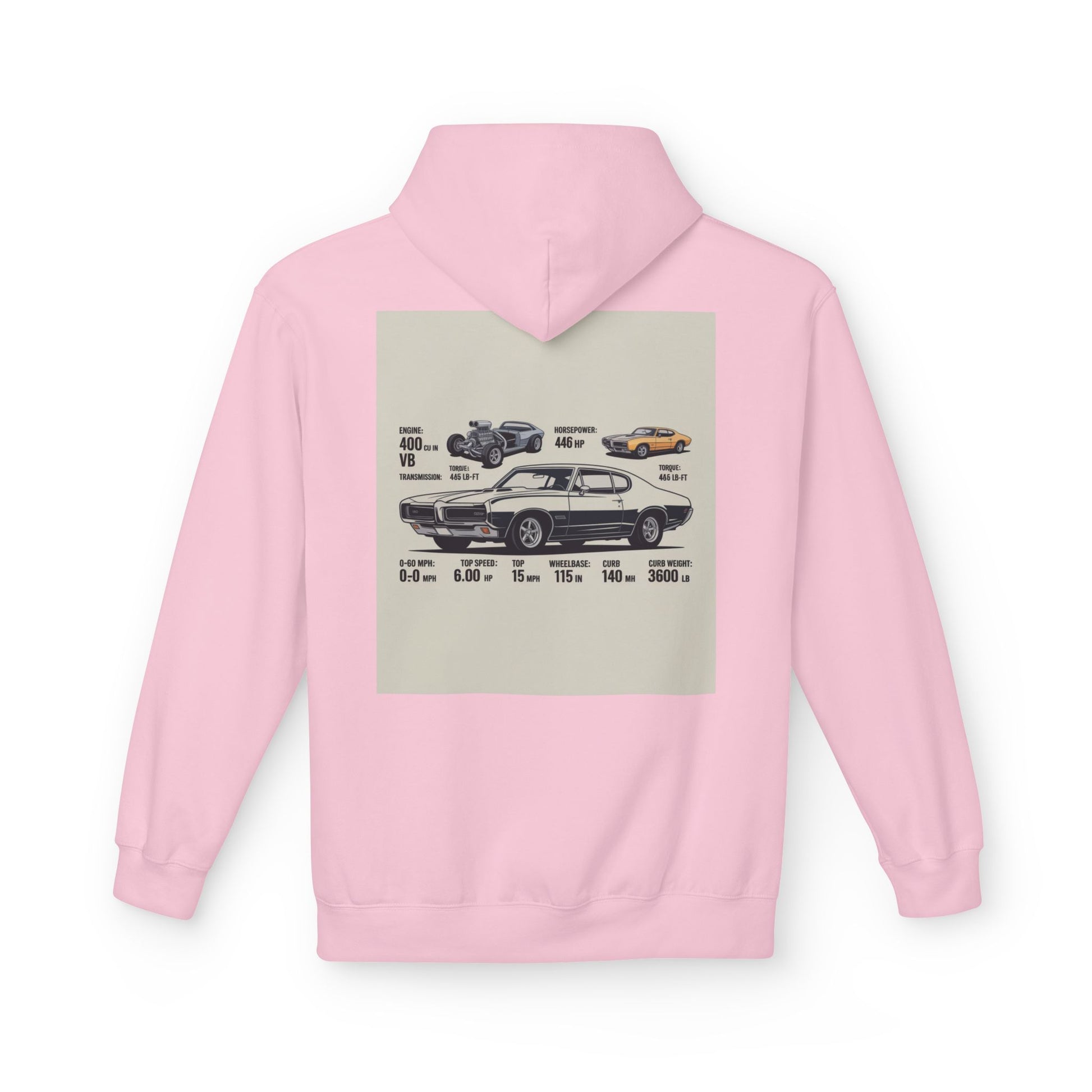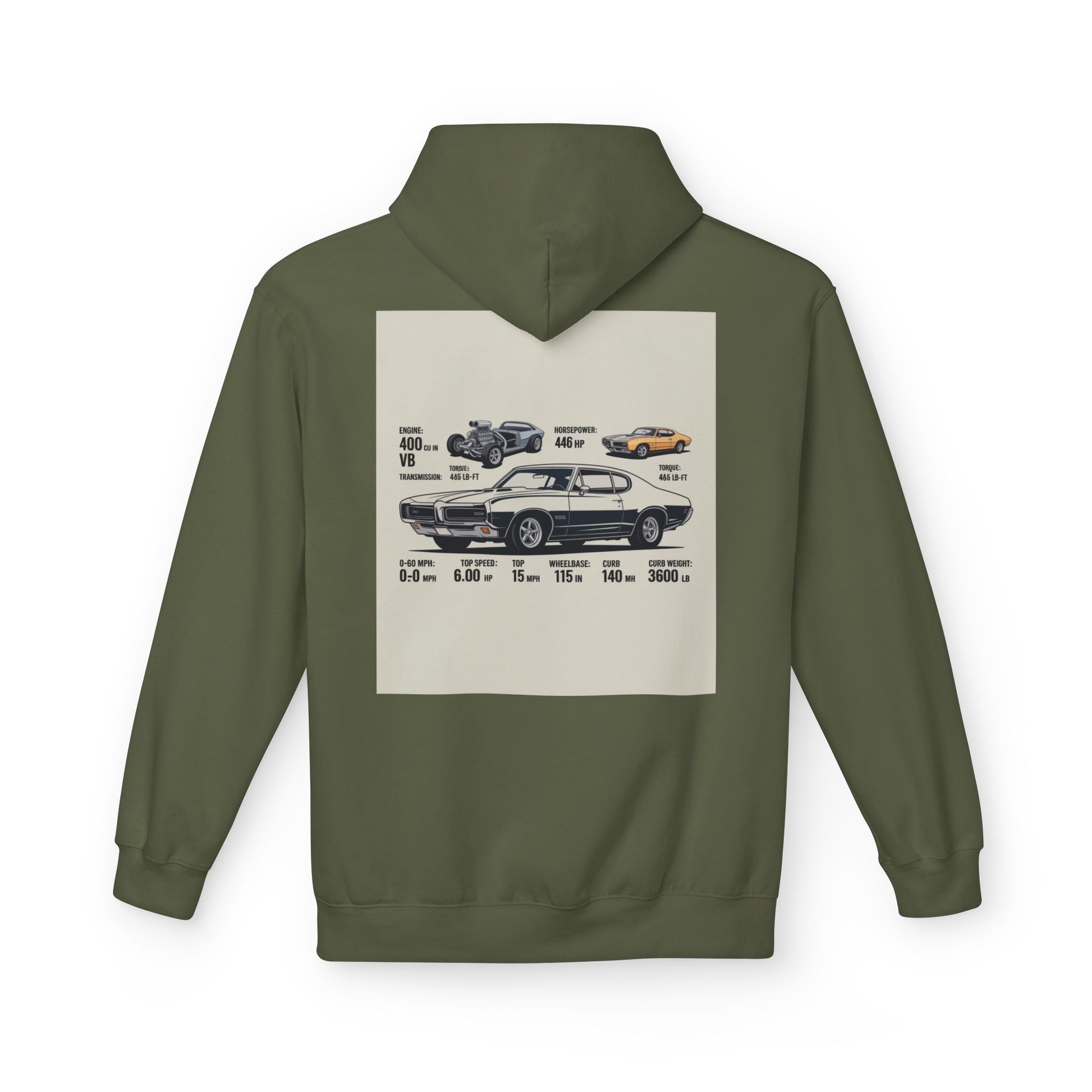 Soft, familiar, and quietly confident — this midweight hoodie feels like the jacket you reach for on crisp mornings and late-night drives. A compact vintage muscle car sits over the heart, while a larger technical illustration rests across the back: engine specs, silhouette, and small details laid out like a mechanic’s sketch. It’s not flashy; it’s for people who love the hum of an old V8, the smell of oil, and the patient rhythm of restoring something with their own hands. Wear it to the garage, to car meets, or on weekend runs when you want comfort that nods to a shared automotive language.